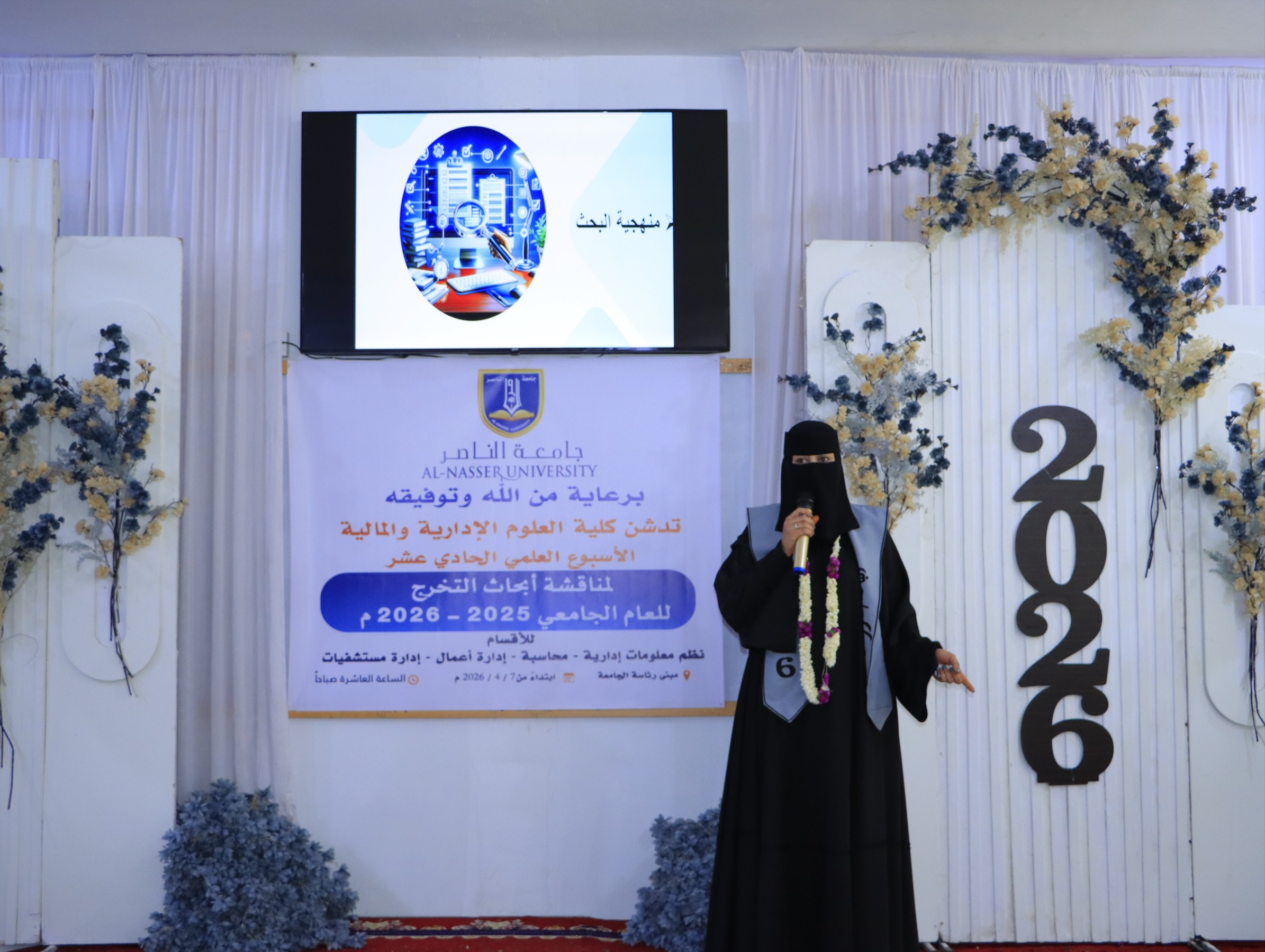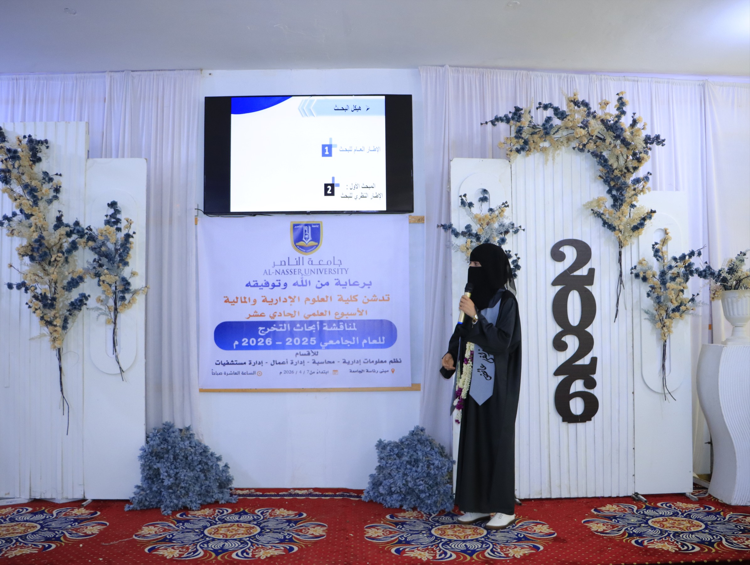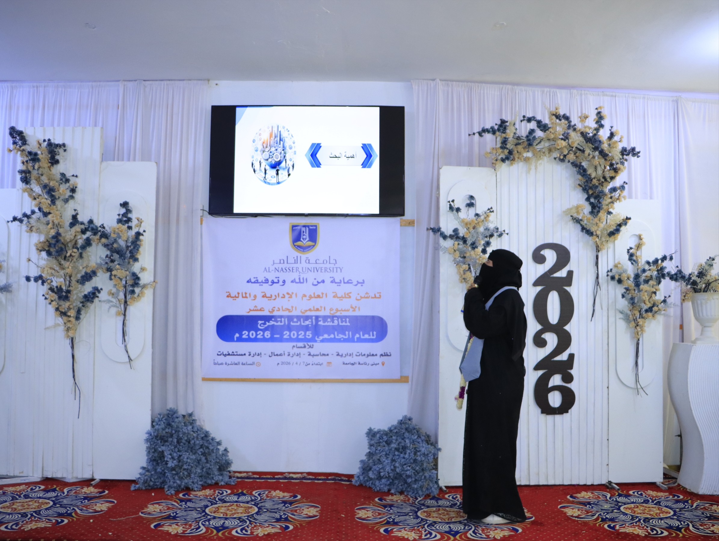 في اختتام الاسبوع العلمي المميز، أنهت جامعة الناصر فعاليات الأسبوع العلمي الحادي عشر لمناقشة أبحاث التخرج للعام الجامعي 2025–2026. وفي وسط أجواء علمية عكست مستوى متقدماً من الأداء الأكاديمي والبحثي لدى طلبة كلية العلوم الإدارية والمالية.