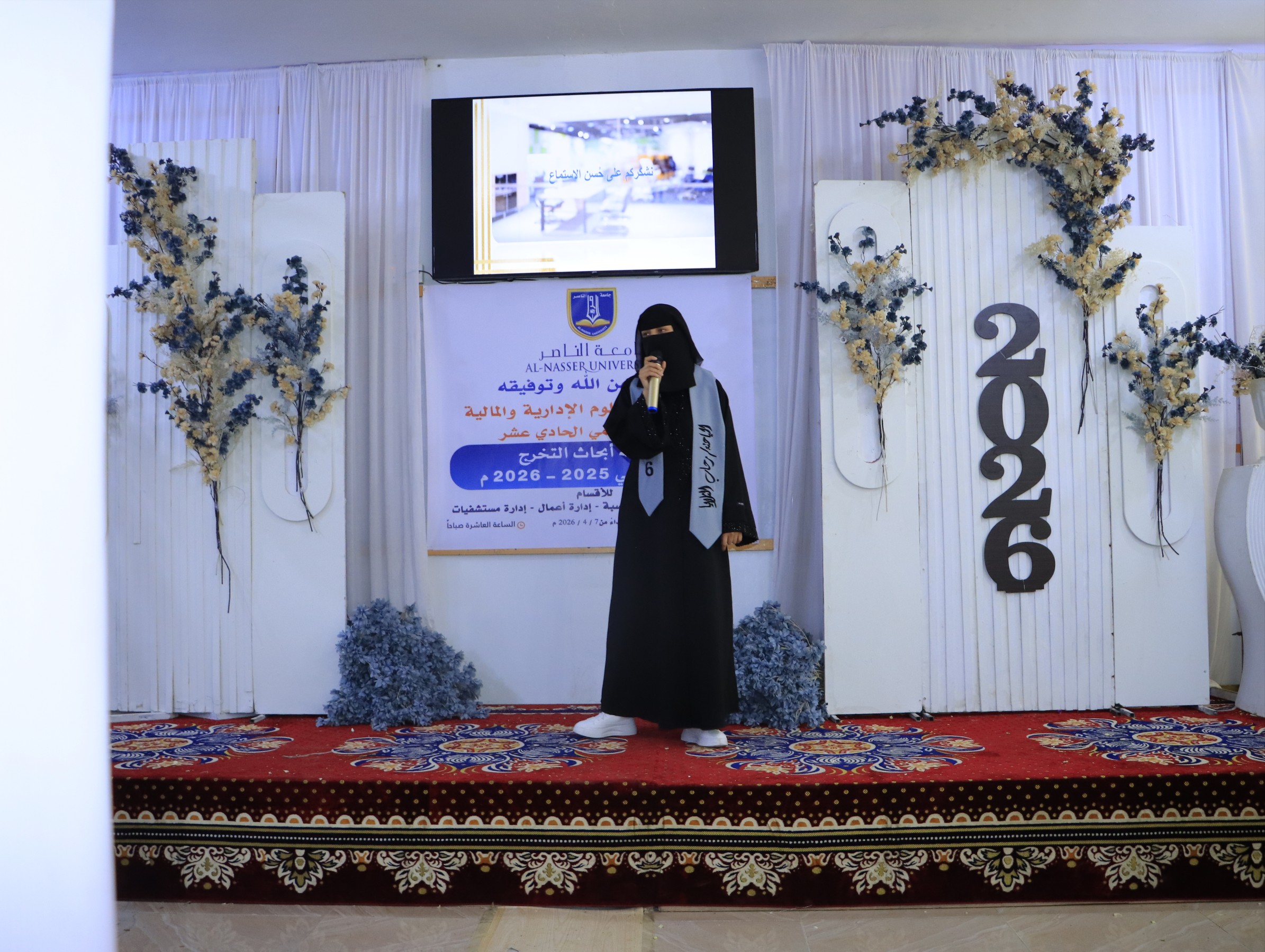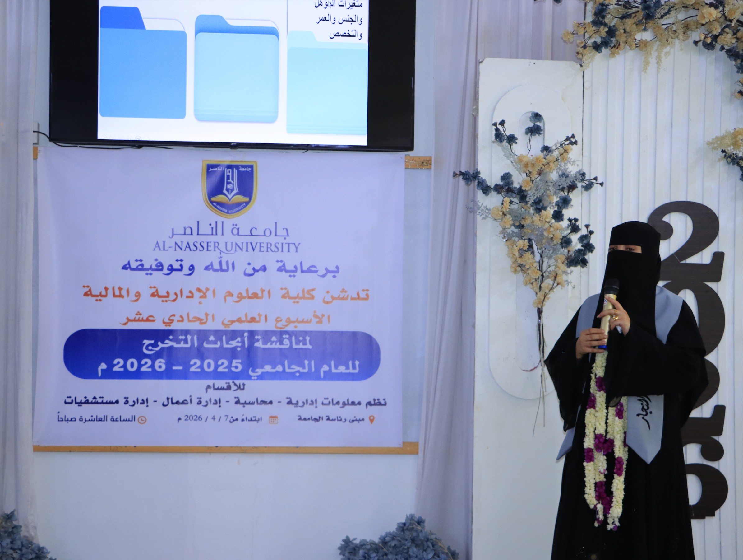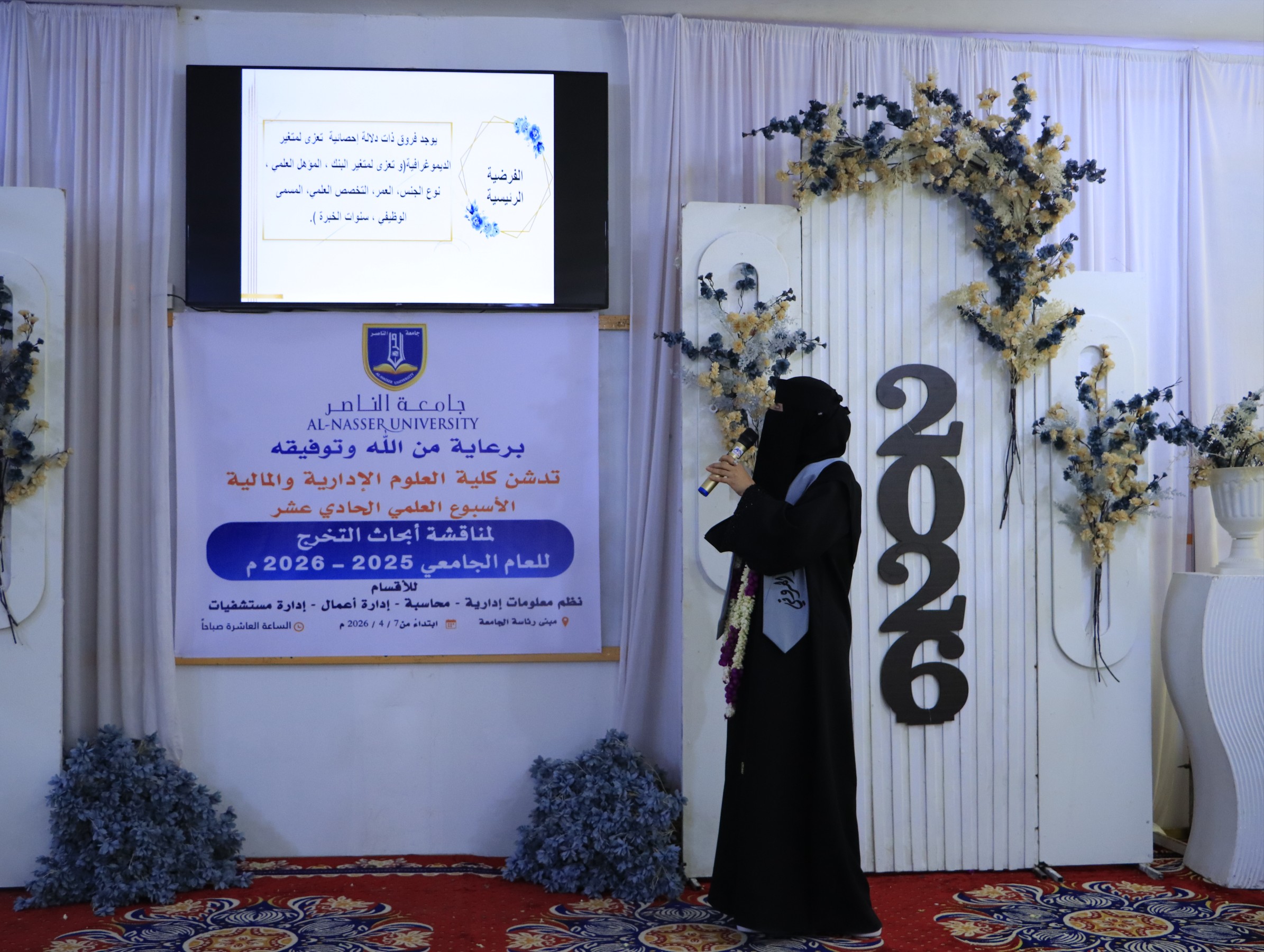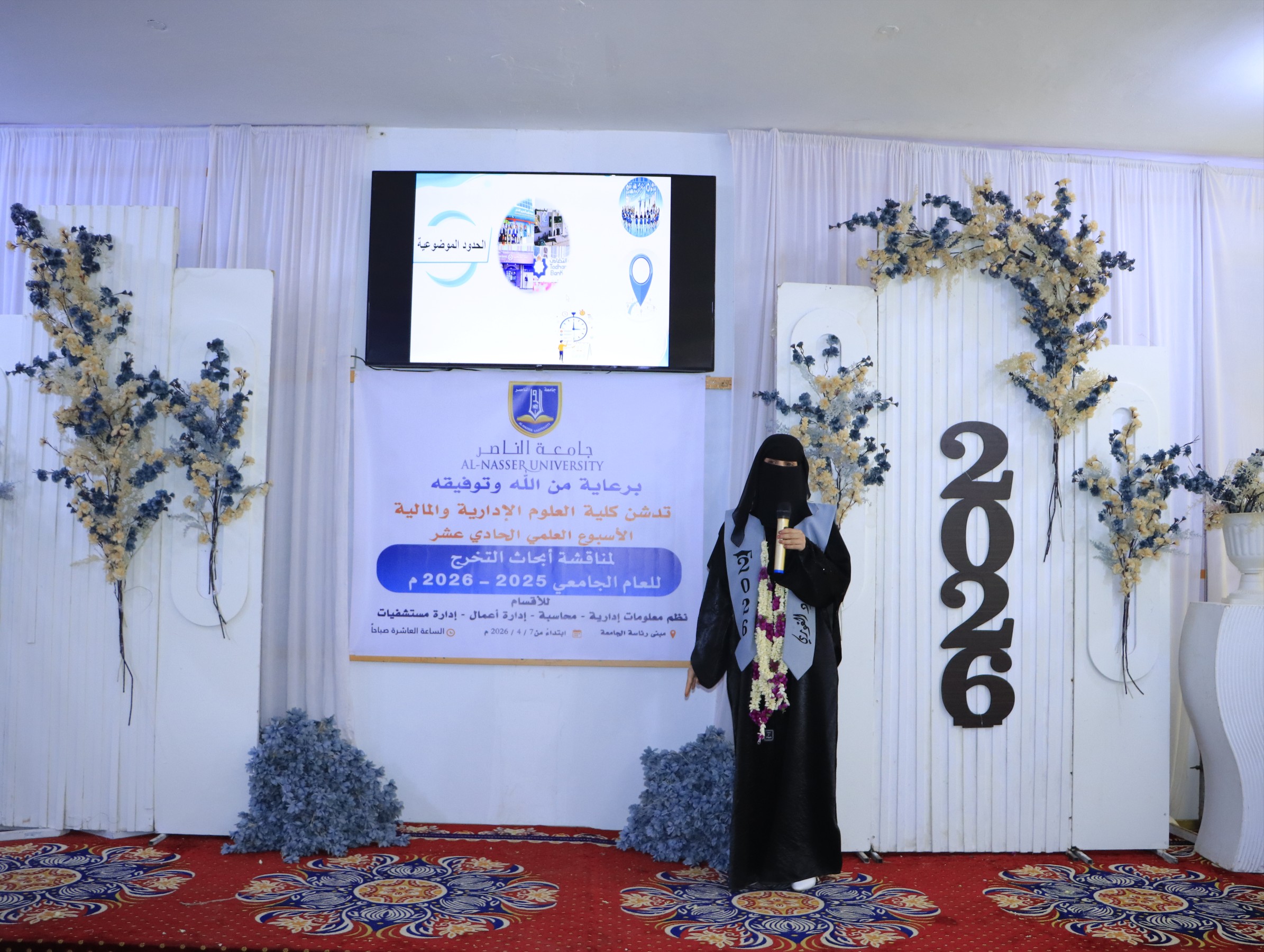 في اختتام الاسبوع العلمي المميز، أنهت جامعة الناصر فعاليات الأسبوع العلمي الحادي عشر لمناقشة أبحاث التخرج للعام الجامعي 2025–2026. وفي وسط أجواء علمية عكست مستوى متقدماً من الأداء الأكاديمي والبحثي لدى طلبة كلية العلوم الإدارية والمالية.