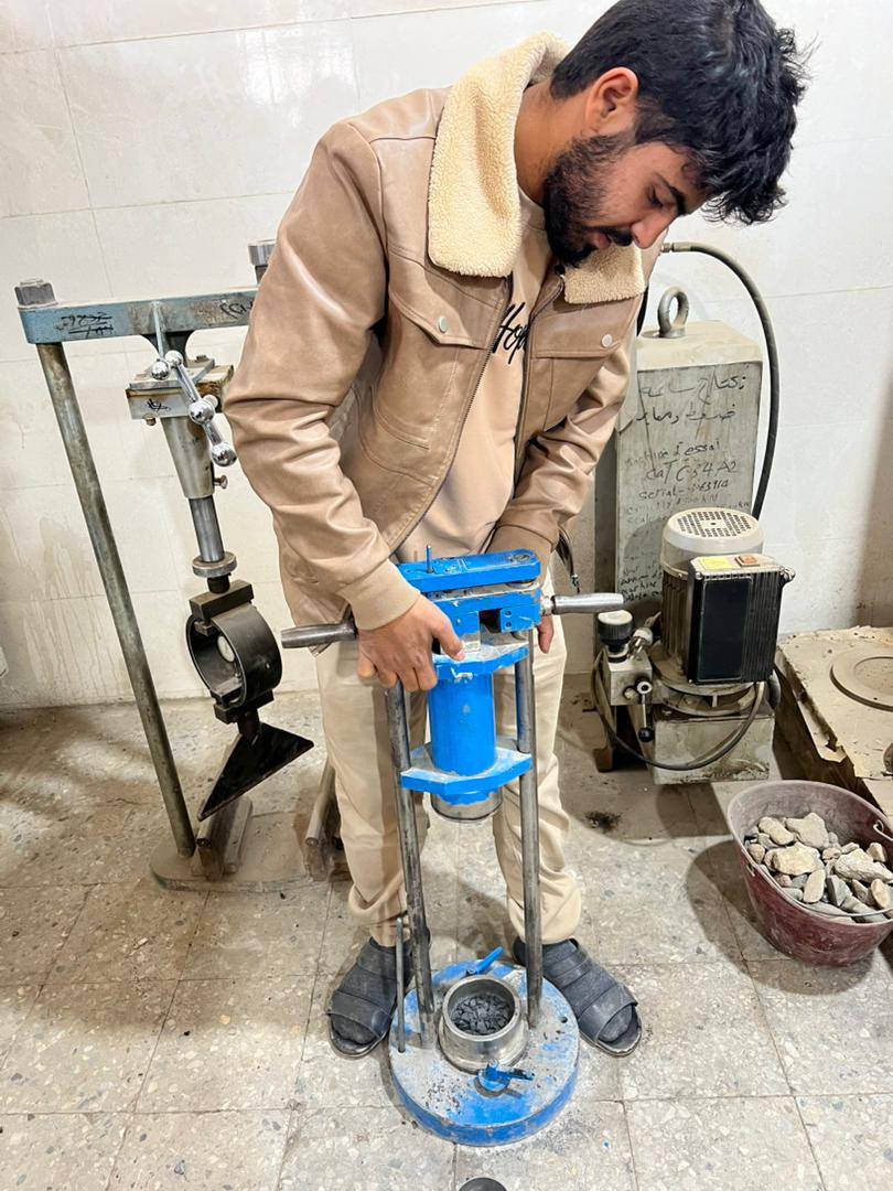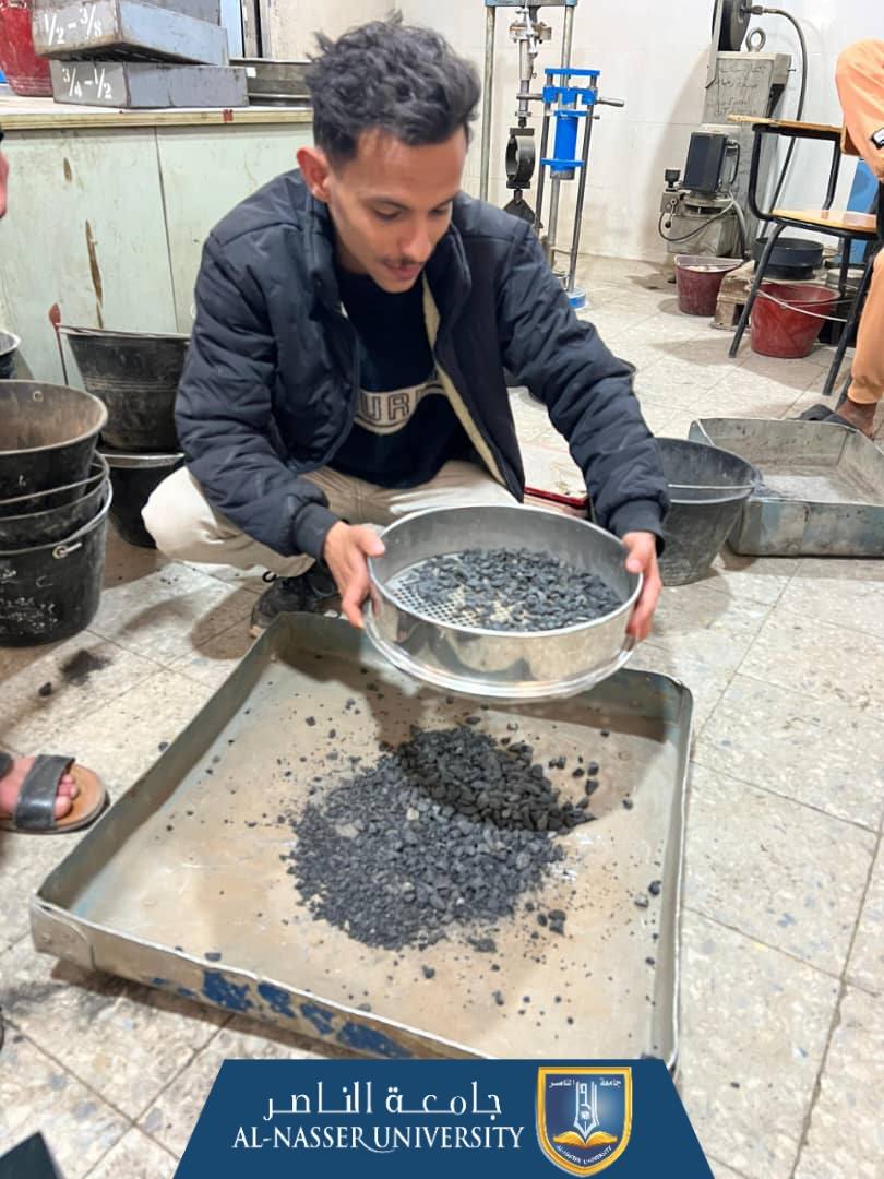 ويشمل التدريب الميداني تنفيذ مجموعة من التجارب والاختبارات العملية ضمن مقرر هندسة الطرق، الذي يُعد من المقررات الأساسية في تخصص الهندسة المدنية، حيث يتلقى الطلبة تدريبًا عمليًا على تصميم الخلطات الإسفلتية وفق المواصفات الأمريكية المعتمدة.