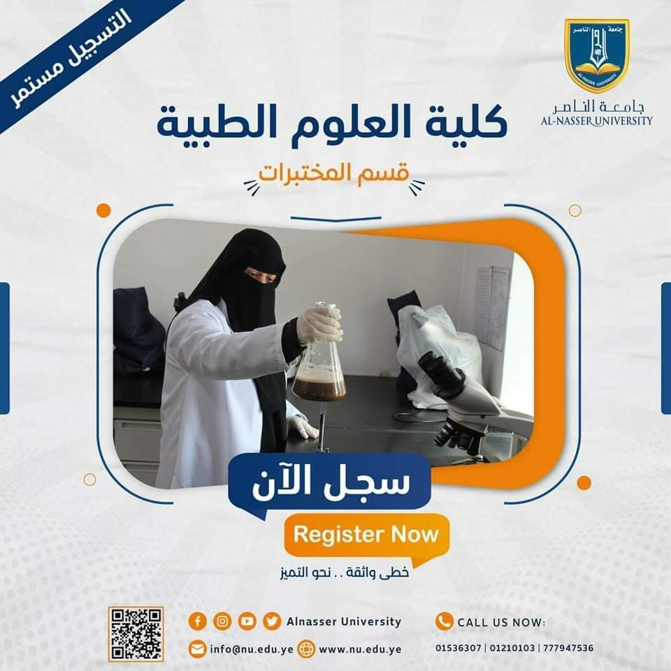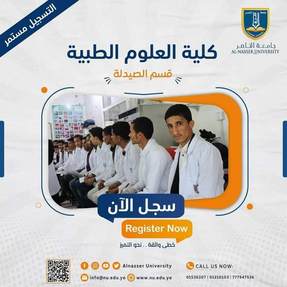 The Faculty of Medical Sciences is the first faculty established at Al-Nasser University. It was founded in 2007 and was previously known as Al-Nasser College of Medical Sciences. The faculty specializes in three main fields: Pharmacy, Community Health, and Laboratory Sciences. Later, the Nursing Department was added, and more recently, in the academic year 2021/2022, the Clinical Nutrition program was introduced.