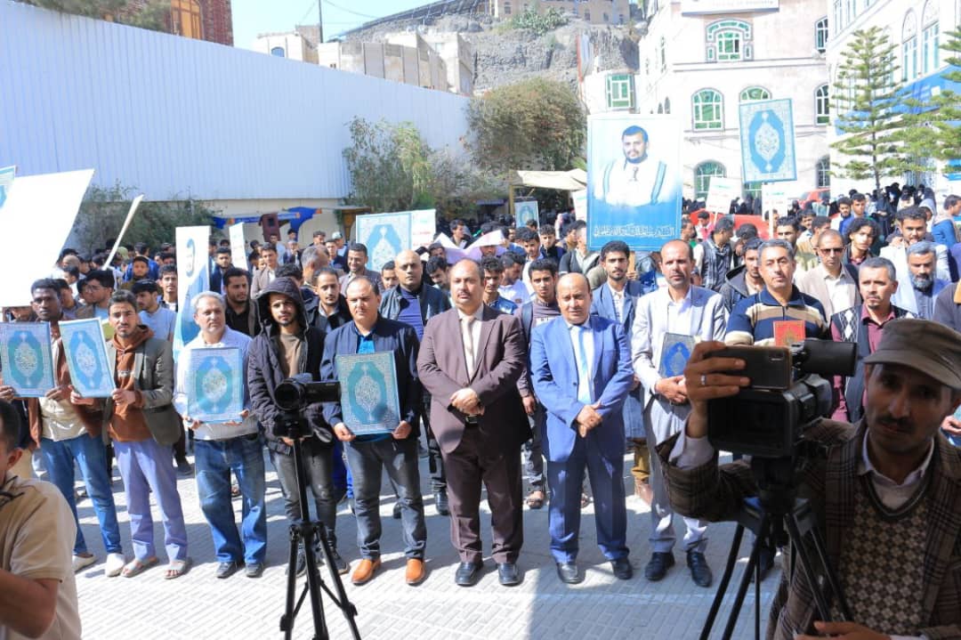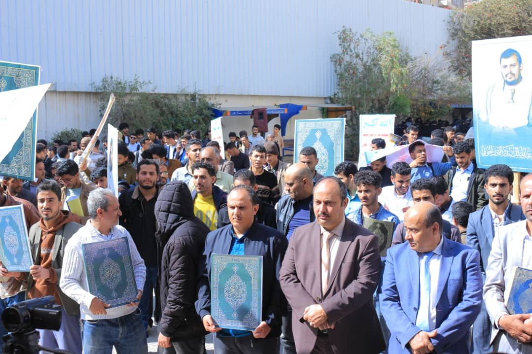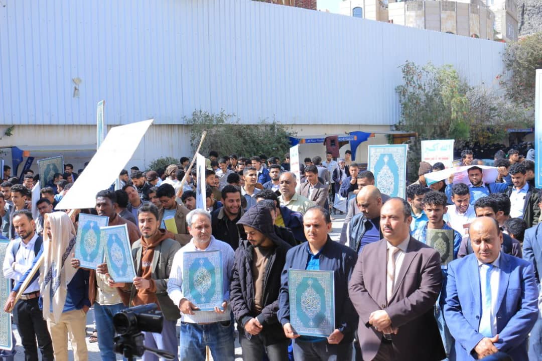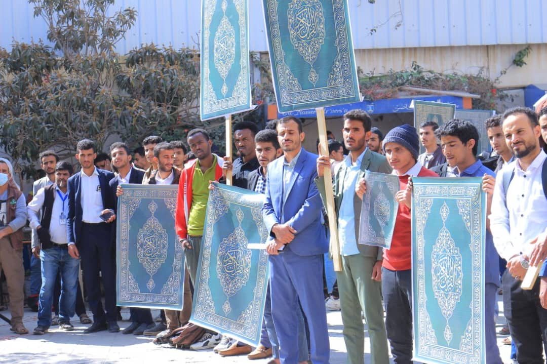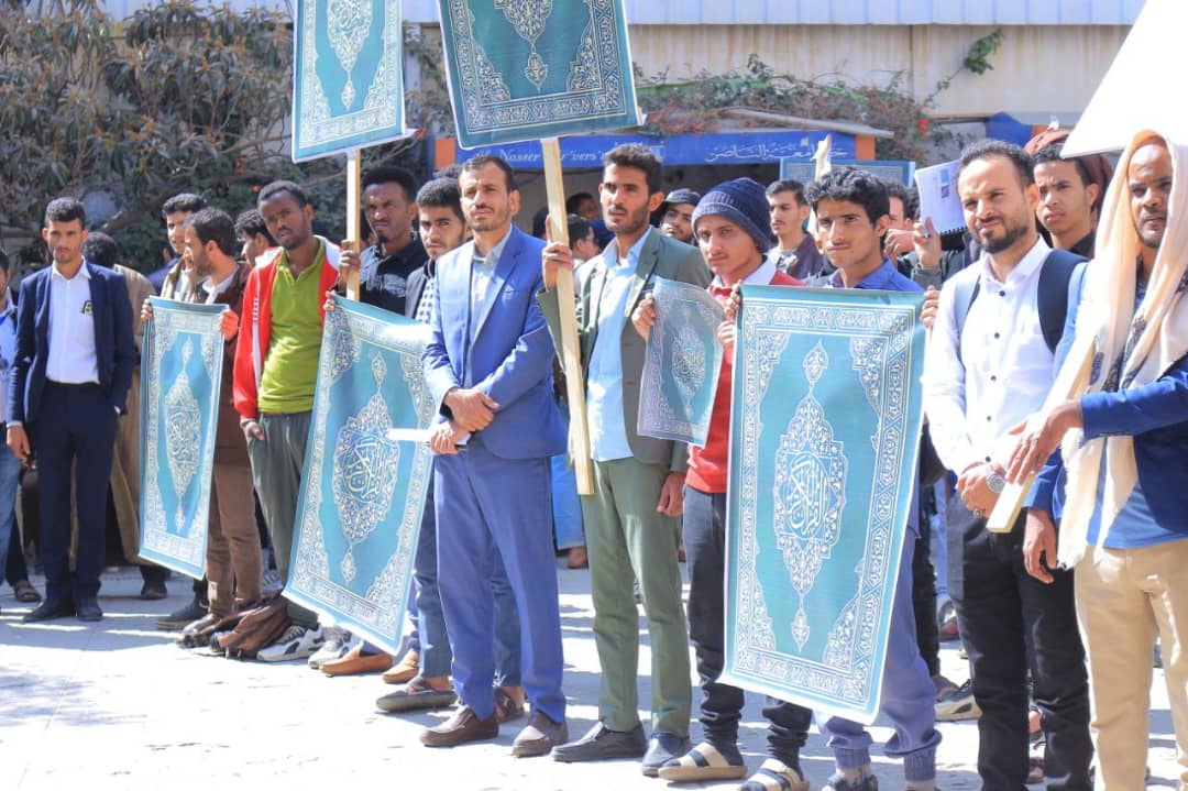 نظّمت جامعة الناصر، اليوم الأربعاء 27 جمادى الآخرة 1447هـ، وقفة حاشدة للتنديد والاستنكار بالإساءة الأمريكية للقرآن الكريم، تأكيداً على الموقف الإيماني الثابت، ورفضاً لكل محاولات النيل من قدسية كتاب الله، وتجديداً للجهوزية في مواجهة مخططات الأعداء، ومواصلة المساندة للشعب الفلسطيني وقضايا الأمة.