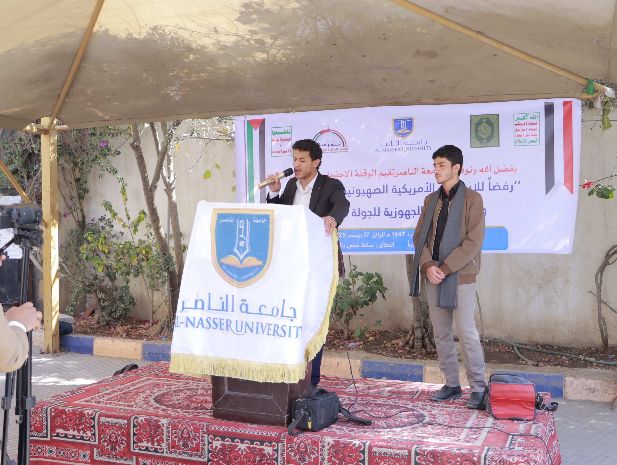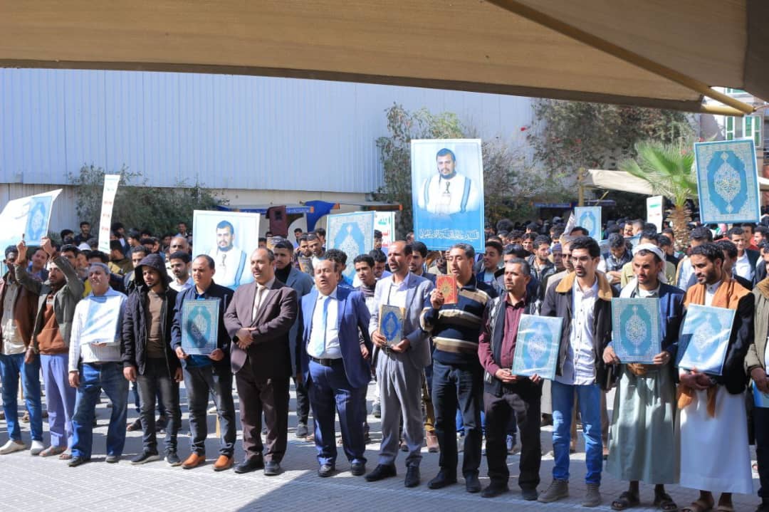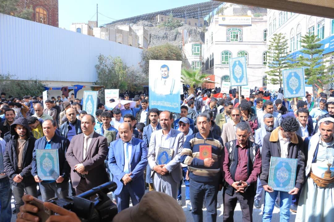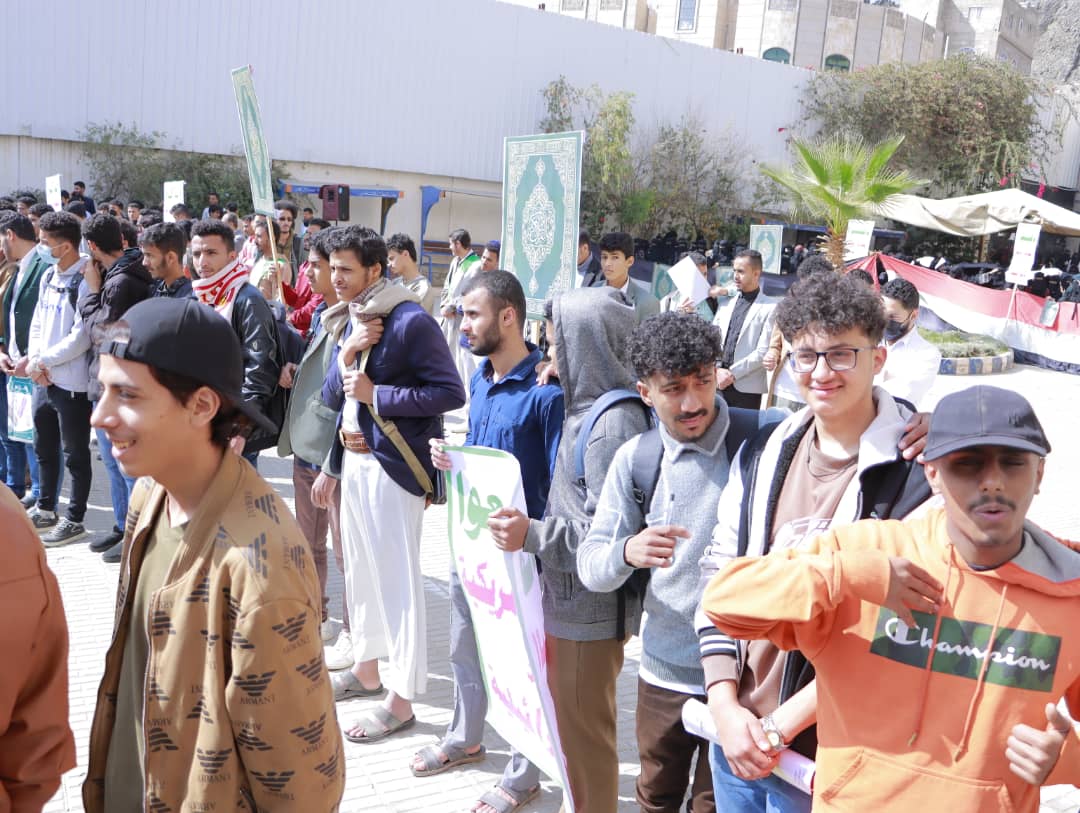 نظّمت جامعة الناصر، اليوم الأربعاء 27 جمادى الآخرة 1447هـ، وقفة حاشدة للتنديد والاستنكار بالإساءة الأمريكية للقرآن الكريم، تأكيداً على الموقف الإيماني الثابت، ورفضاً لكل محاولات النيل من قدسية كتاب الله، وتجديداً للجهوزية في مواجهة مخططات الأعداء، ومواصلة المساندة للشعب الفلسطيني وقضايا الأمة.