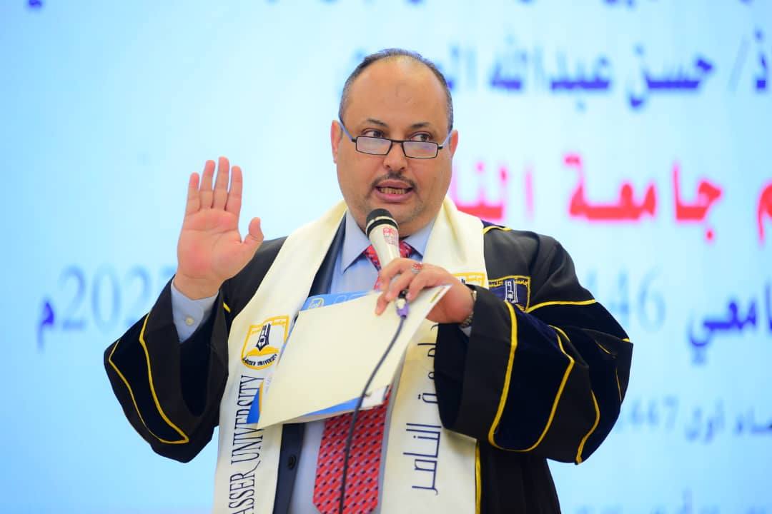 وفي كلمته الافتتاحية، رحّب رئيس الجامعة الأستاذ الدكتور ناصر هادي الموفري بالحاضرين جميعاً، مثمناً الجهود الكبيرة لأسرة جامعة الناصر من أكاديميين وإداريين، ومشيداً بأعضاء هيئة التدريس الذين يؤدّون مهامهم بروحٍ من المسؤولية واستشعار رقابة الله في أداء رسالتهم التعليمية السامية.