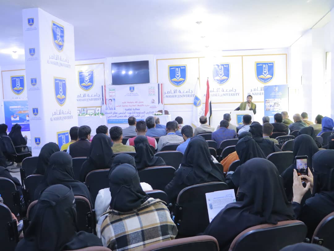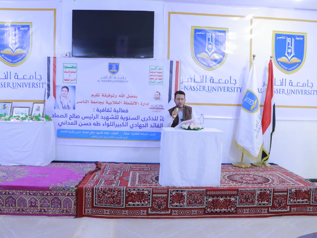 أقامت الأنشطة الطلابية بجامعة الناصر، اليوم الأربعاء، في تمام الساعة العاشرة صباحًا، فعالية ثقافية إحياءً للذكرى السنوية للشهيد الرئيس صالح الصماد والقائد الجهادي الكبير اللواء طه حسن المداني، وذلك في قاعة الشهيد الصماد بالجامعة، بحضور عدد من قيادات الجامعة الأكاديمية والإدارية.