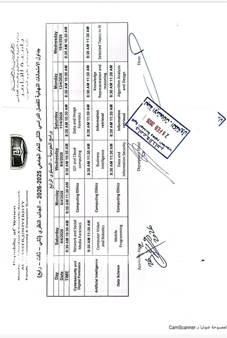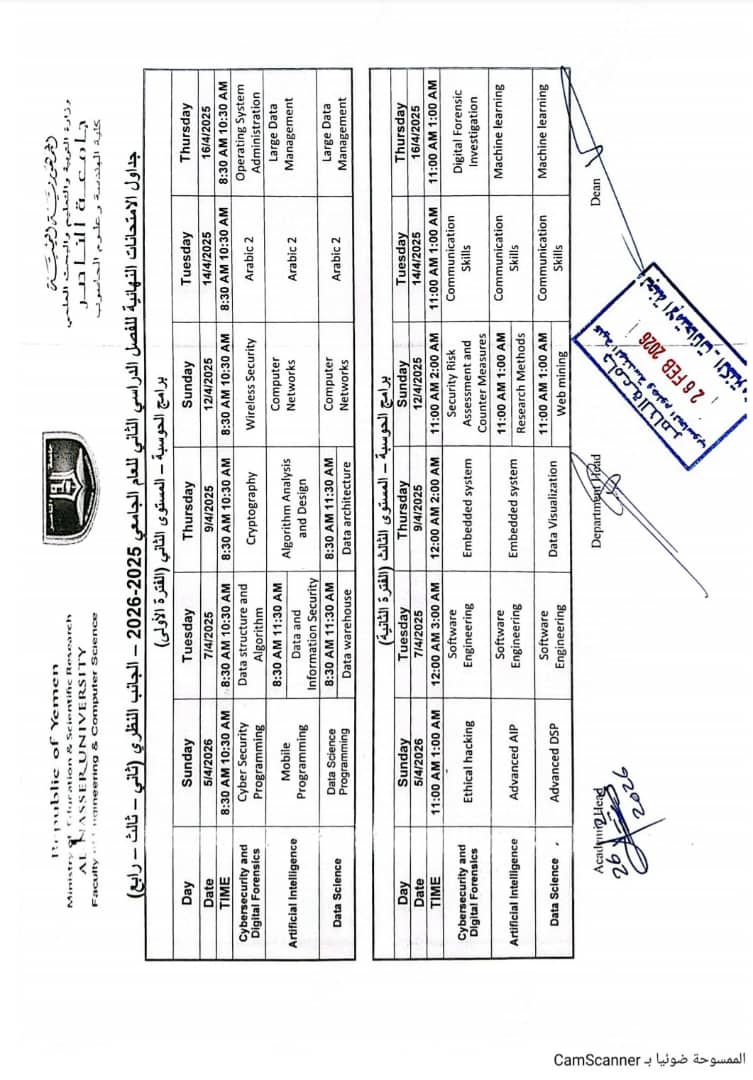 1جداول امتحانات الامن السيبراني والتحري الرقمي الترم الثاني للعام الجامعي 2025 / 2026 م المستوى الثانيالمستوى الثانيتحميل