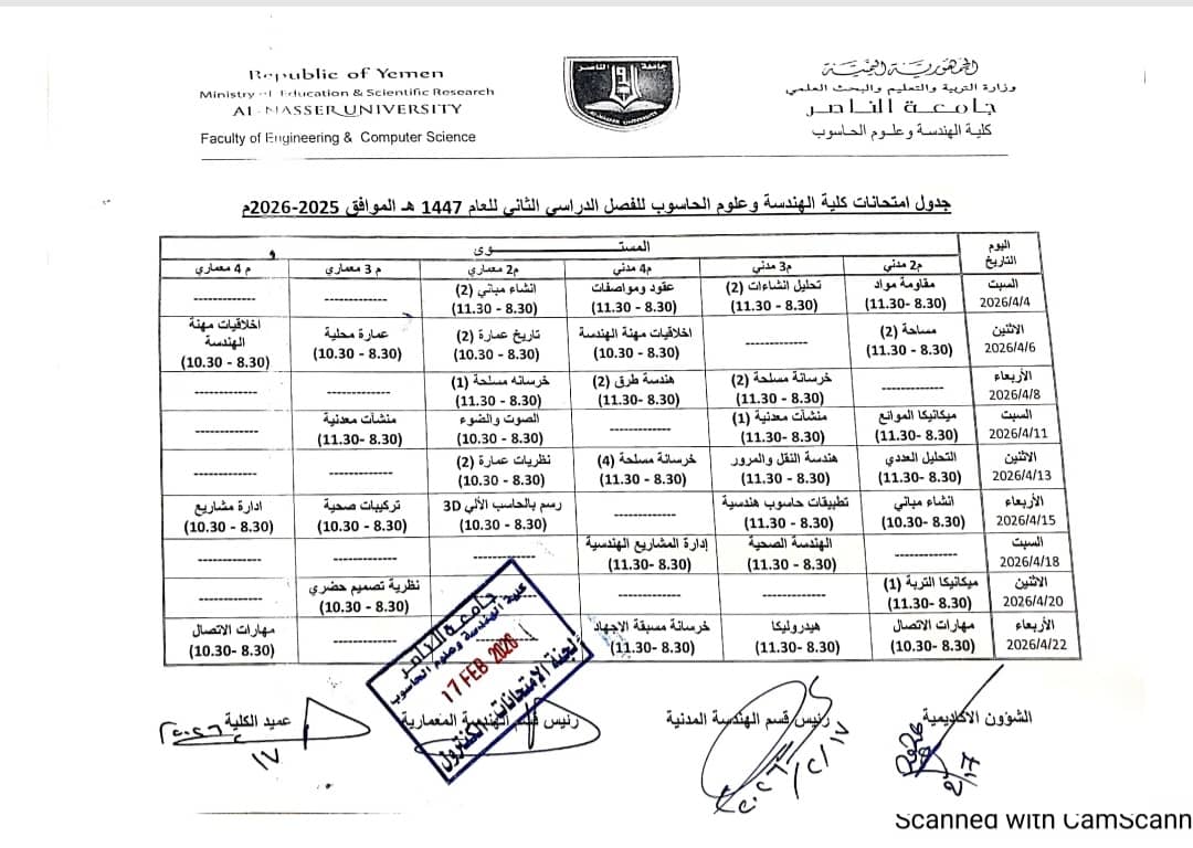 1جداول امتحانات الهندسة المدنية الترم الثاني للعام الجامعي 2025 / 2026 م المستوى الرابعالمستوى الرابعتحميل
