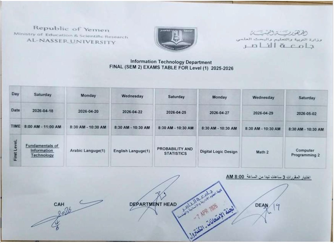 1جداول امتحانات قسم تقية المعلومات مستوى اول للفصل الدراسي الثاني 2025 - 2056 مالمستوى الاولتحميل